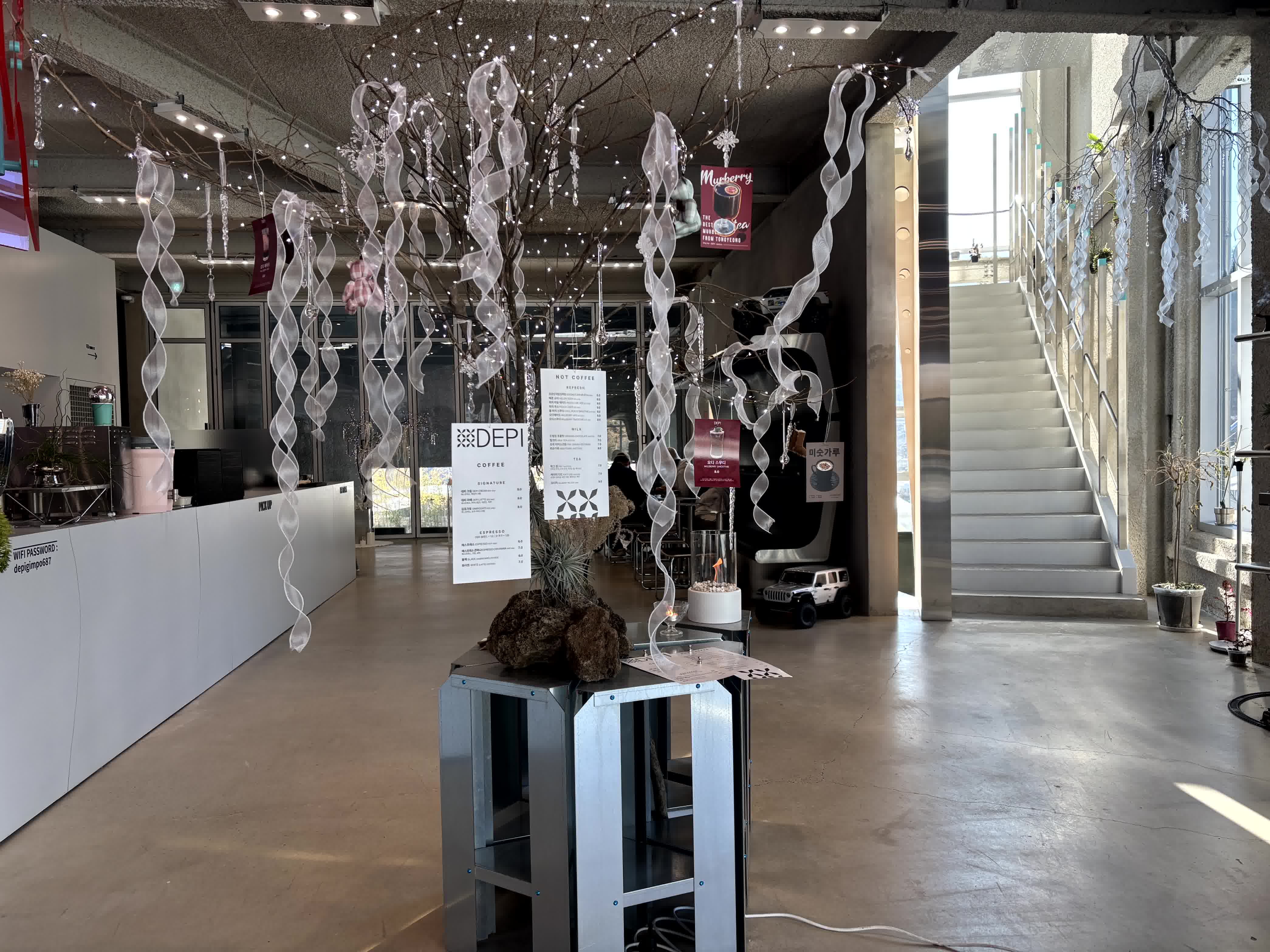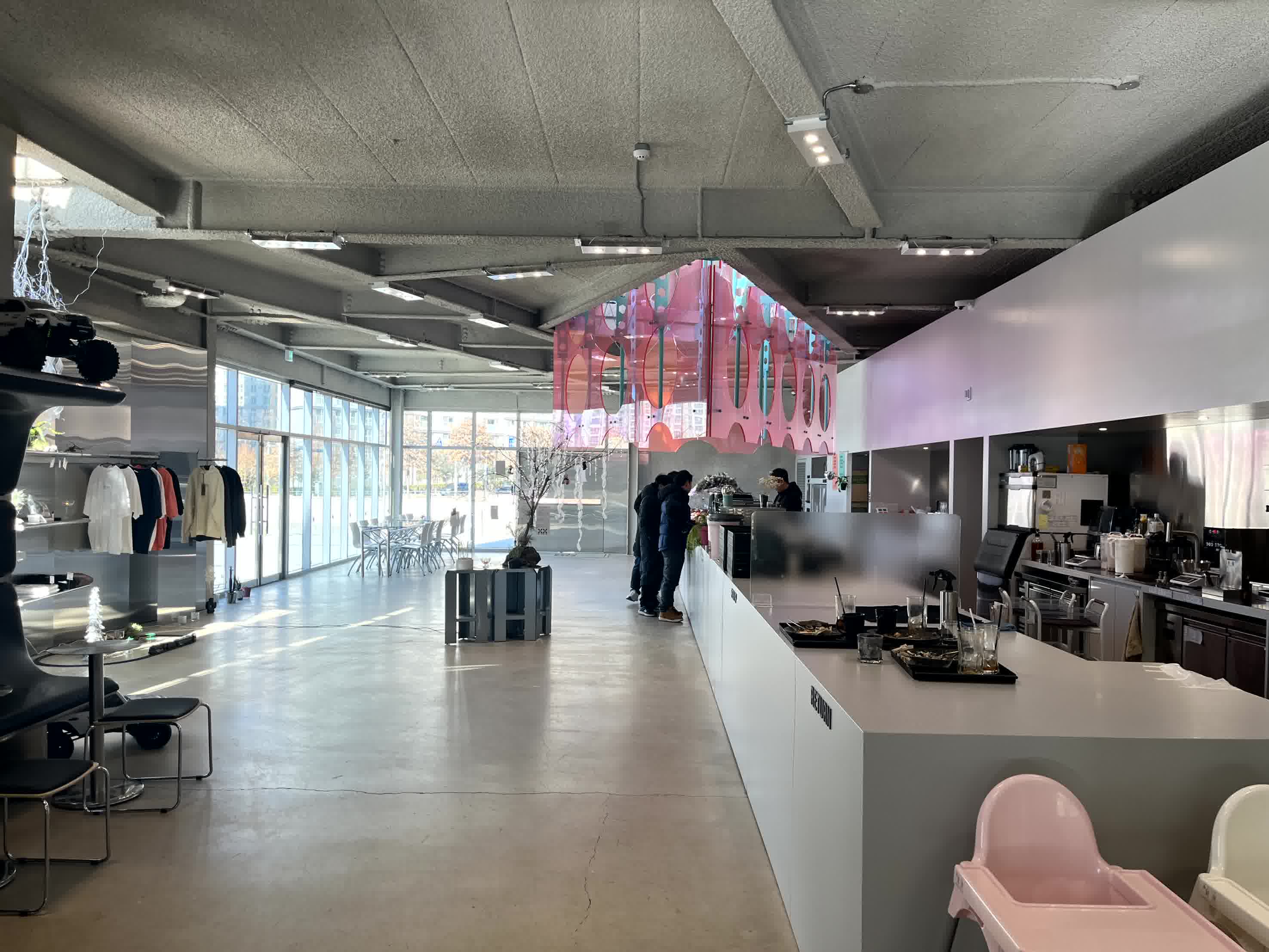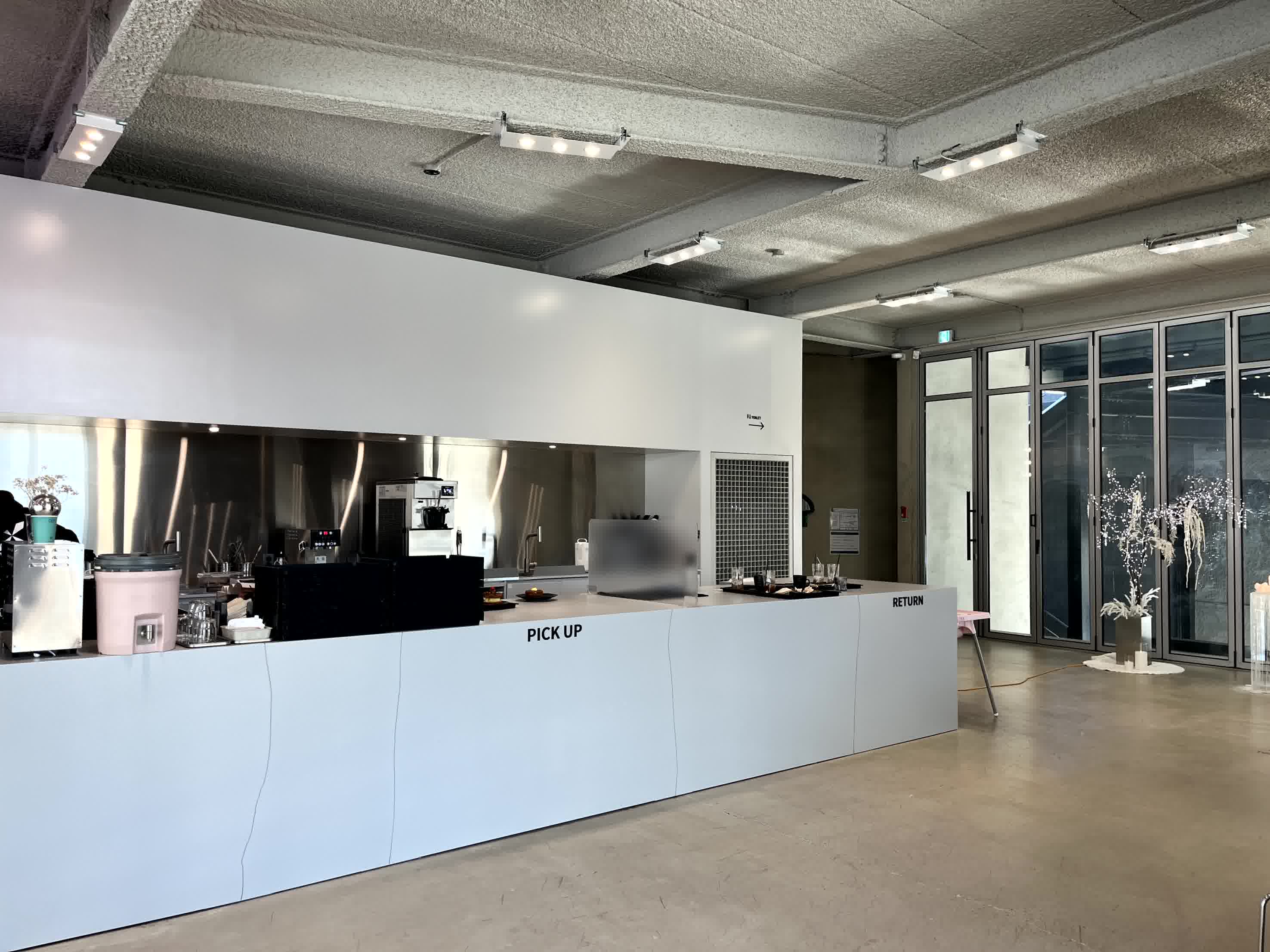 뿜칠을 노출하는건 뭐 요즘 카페들의 천편일률적인 인테리어로 보이지만, 조명을 대피의 로고처럼 만들었다는 점이 이 매장의 시그니처가 아닐까 싶습니다.