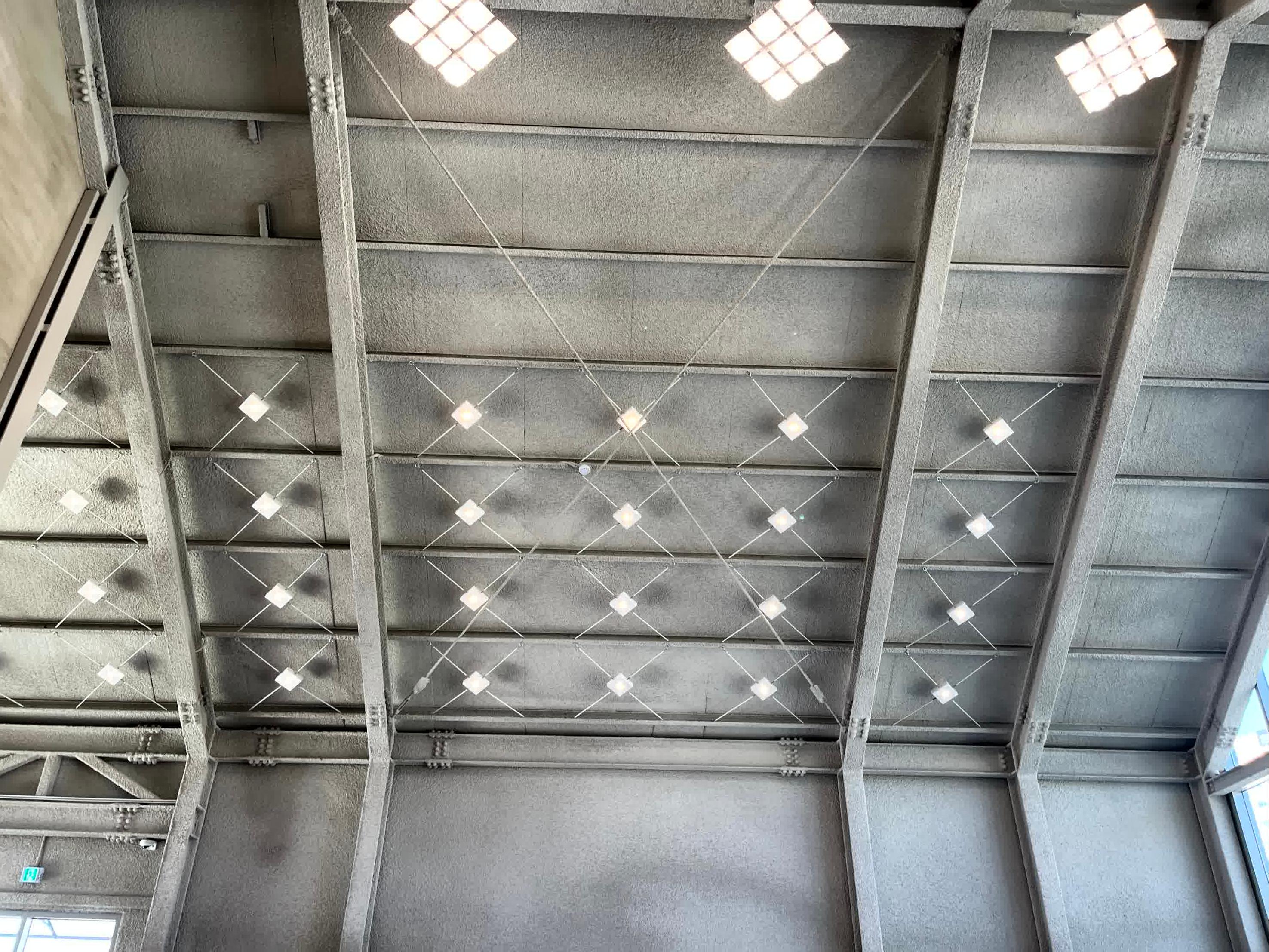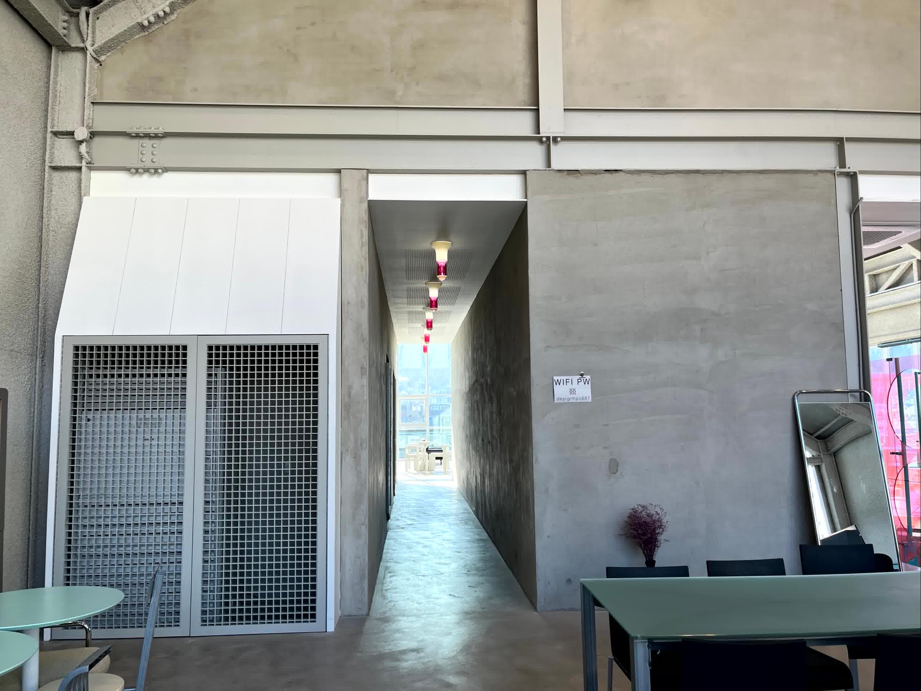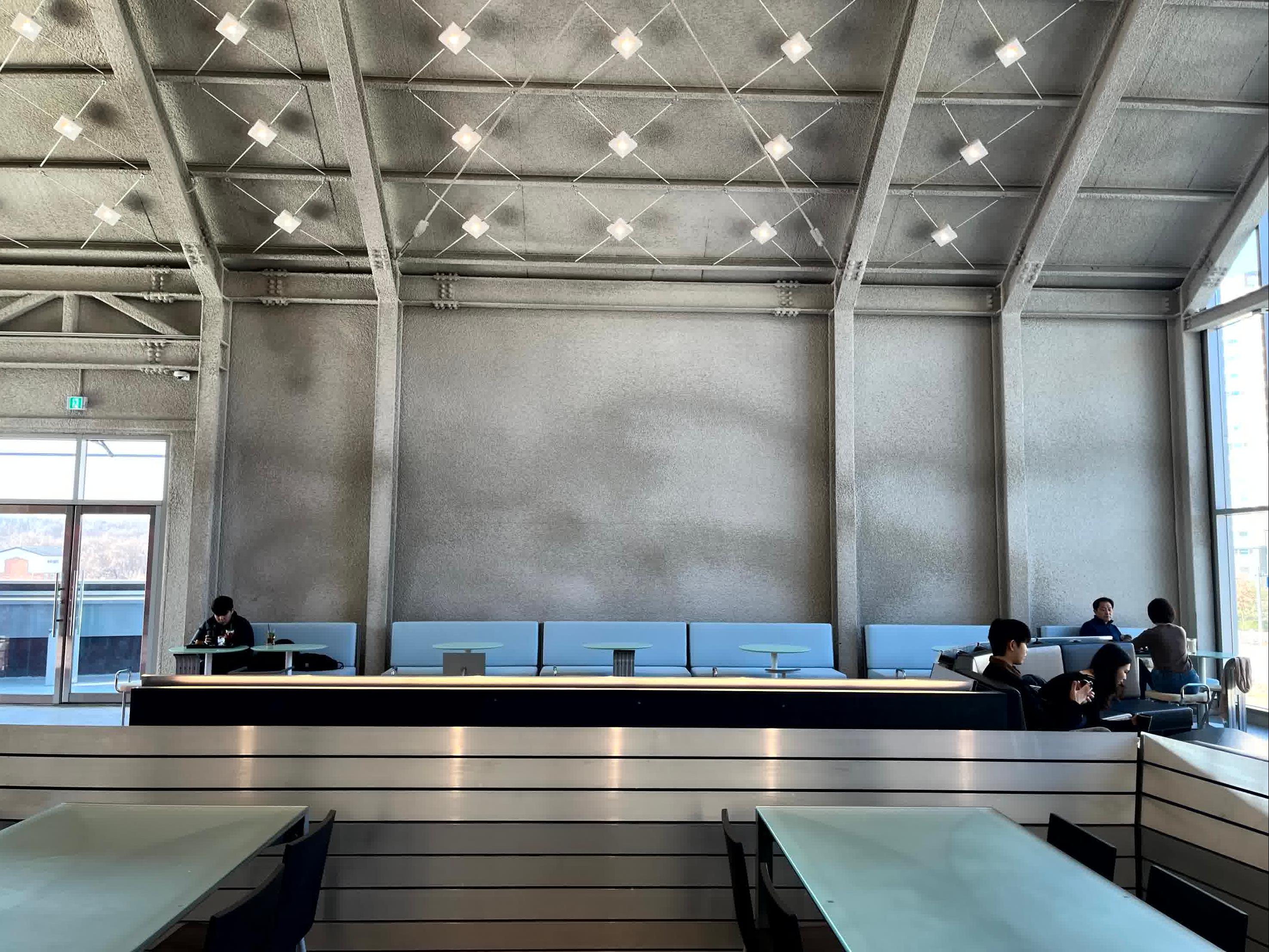 뿜칠을 노출하는건 뭐 요즘 카페들의 천편일률적인 인테리어로 보이지만, 조명을 대피의 로고처럼 만들었다는 점이 이 매장의 시그니처가 아닐까 싶습니다.