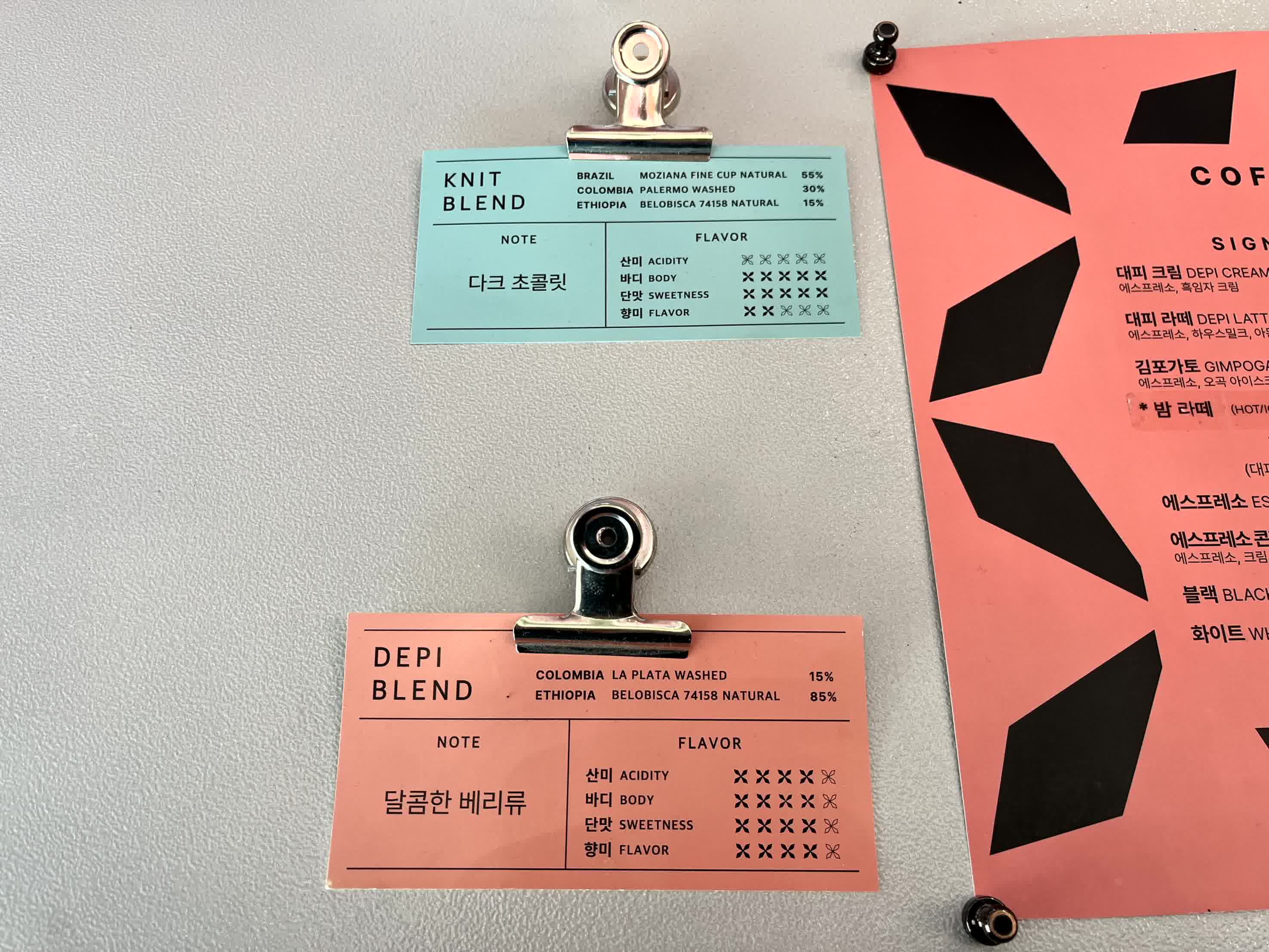- 니트 블렌드 : 브라질 55%, 콜롬비아 30%, 에티오피아 15%