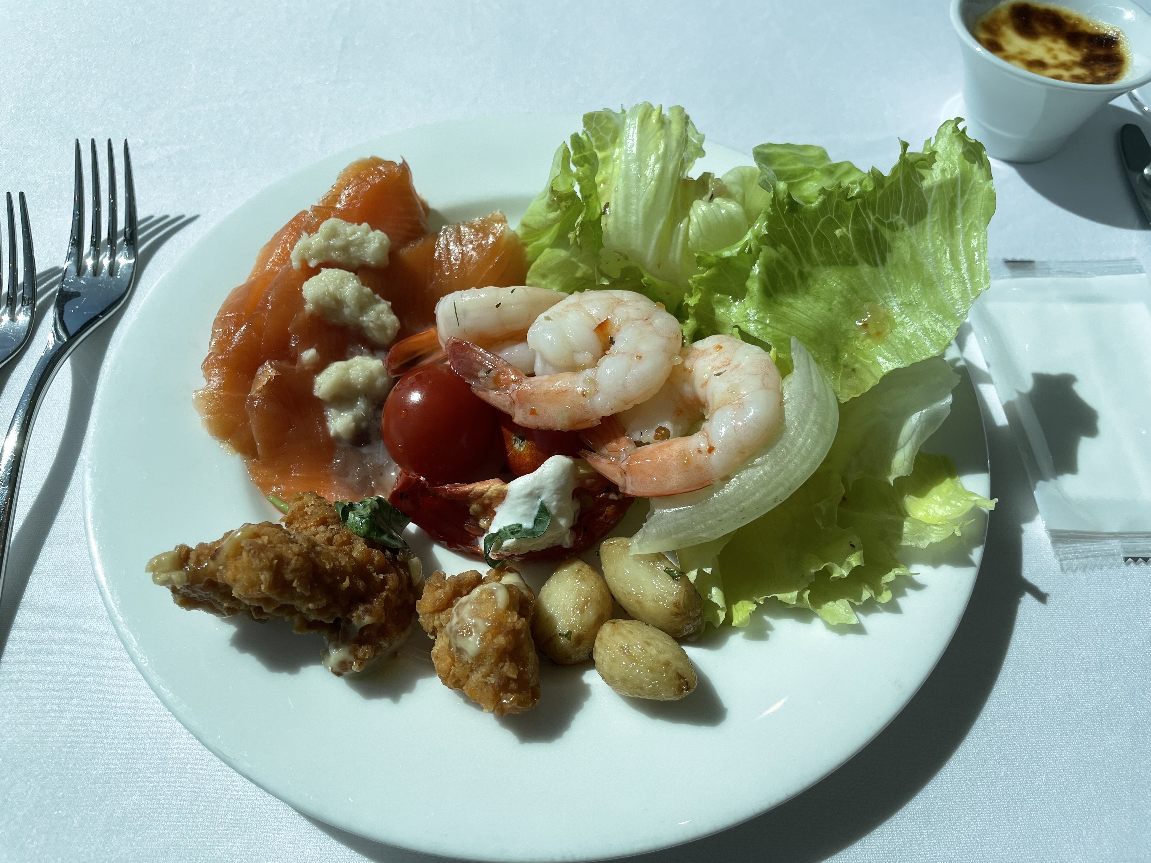 제 첫 접시는 양상추 샐러드와 방울토마토 마늘구이 새우랑 생연어 입니다