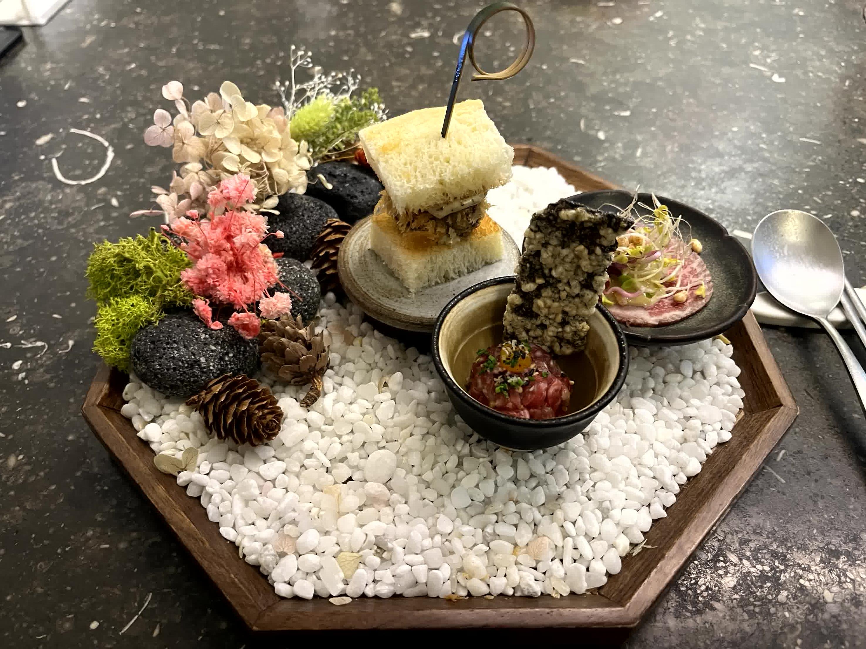 - 한우 삼품(볏짚구이 편채, 안심샌드, 육회와 김부각)