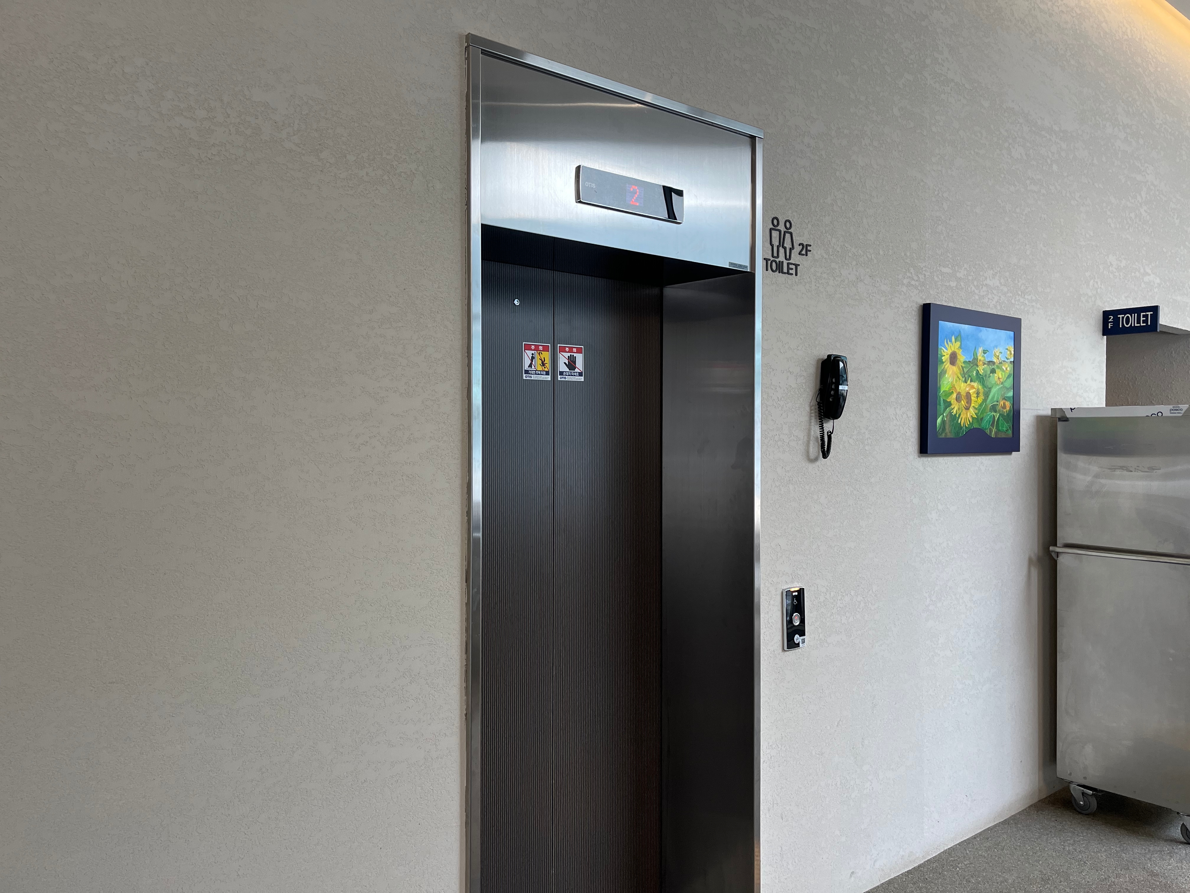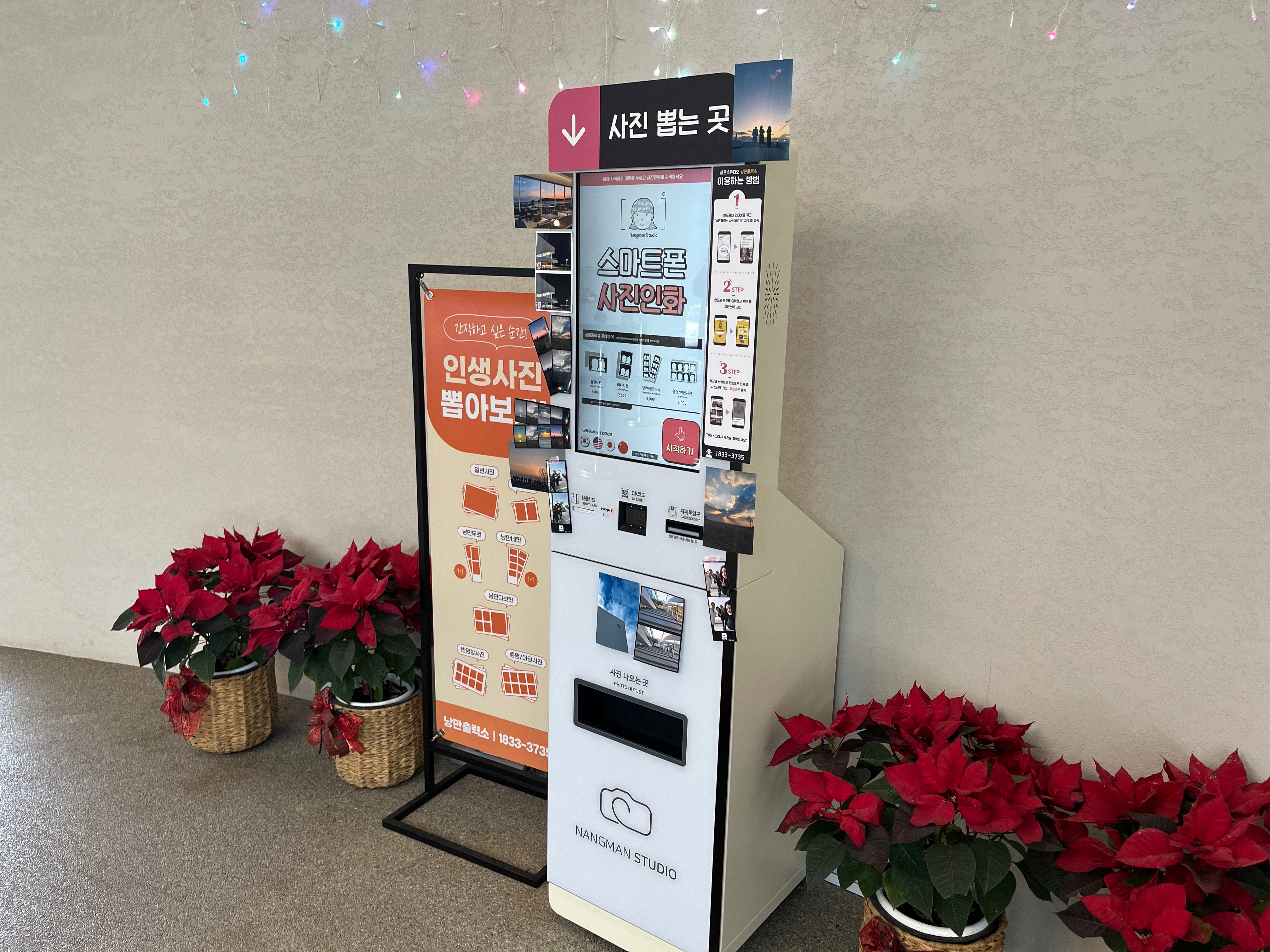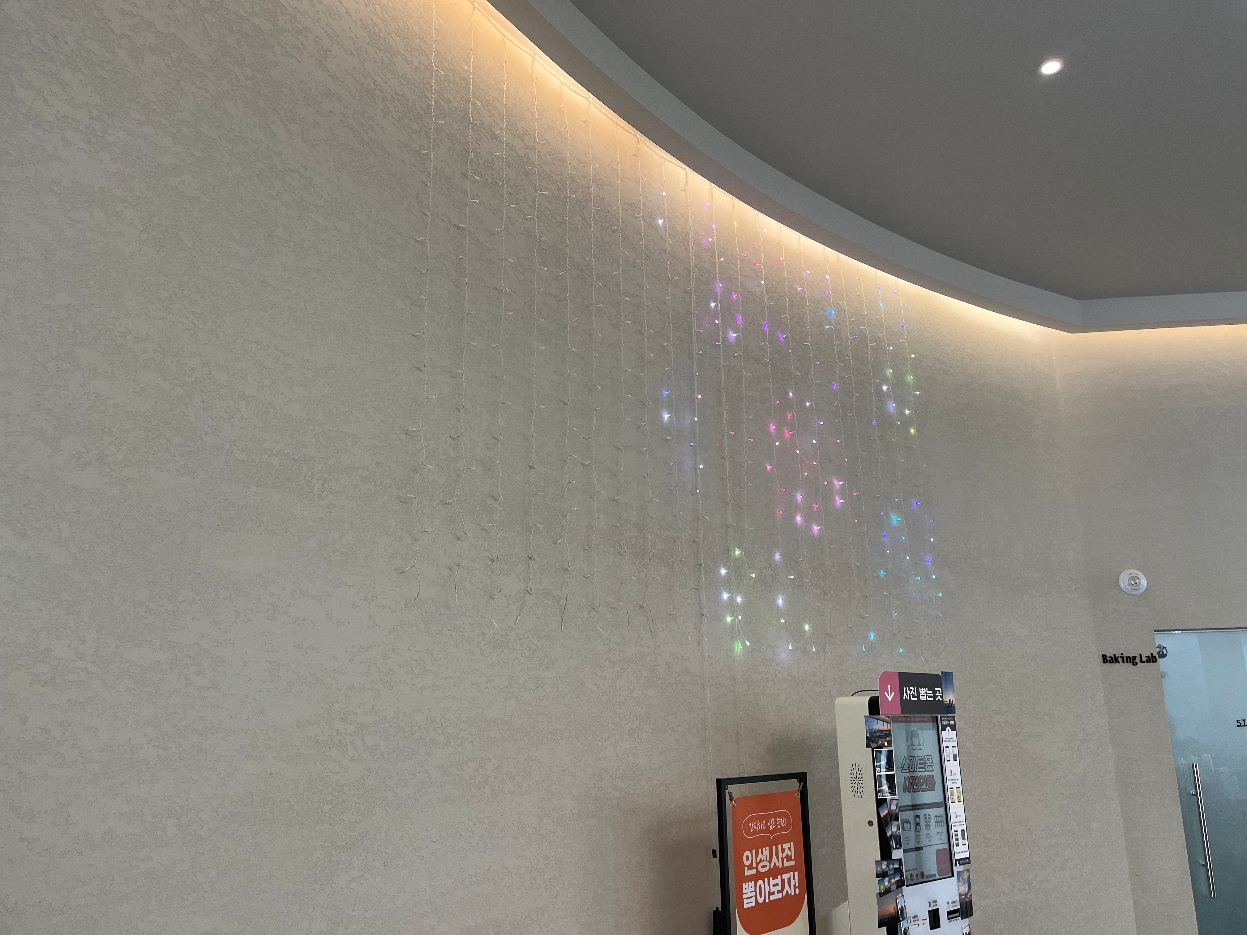 지상1층은 주문을 할 수 있는 매대와 베이커리 메뉴가 있고 스마트폰 인화기, 엘리베이터, 이쁜 벽면이 있습니다.