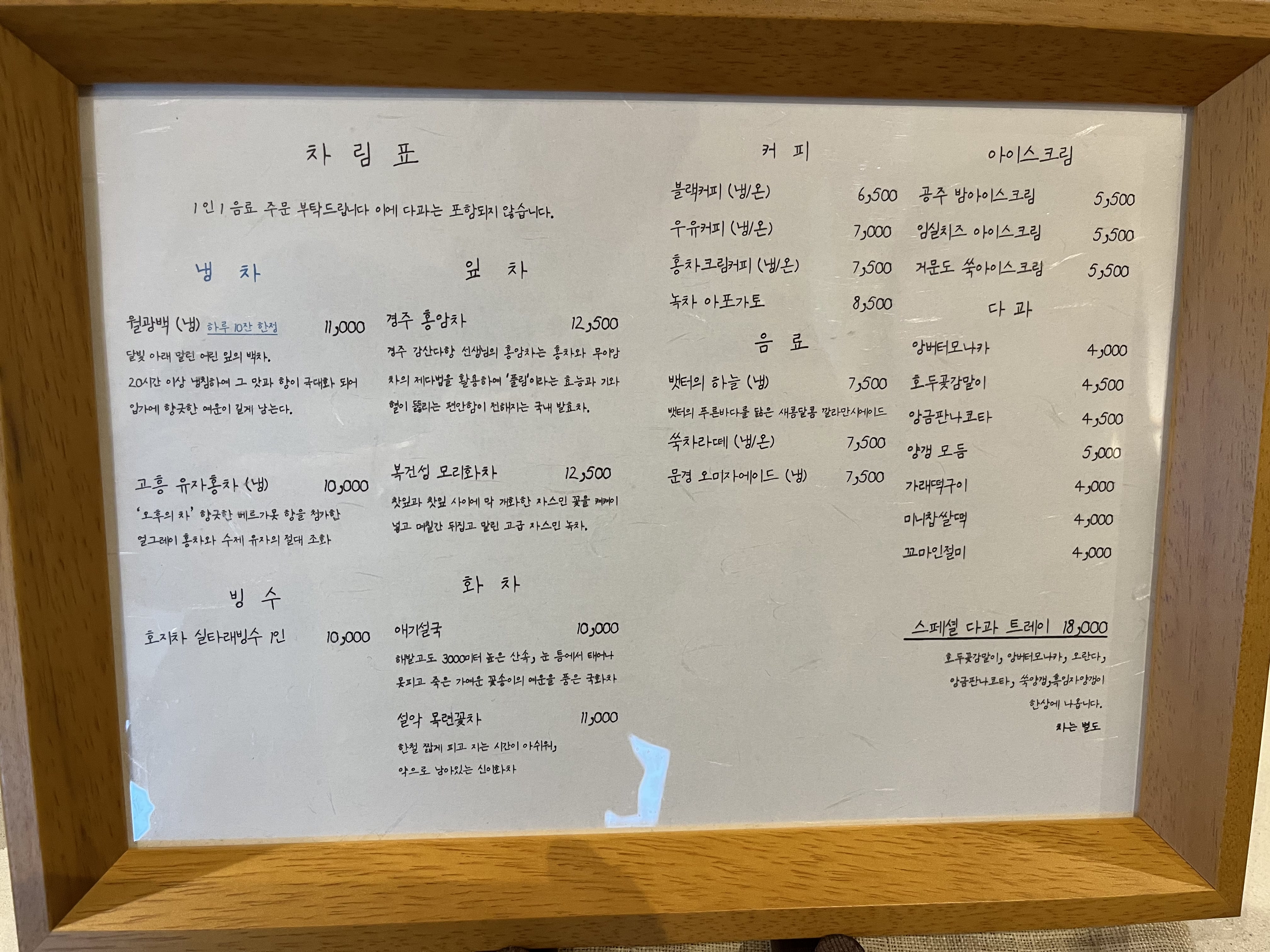 저는 설악 목련꽃차를 시켰고, 와이프는 문경 오미자 에이드를 주문했습니다.