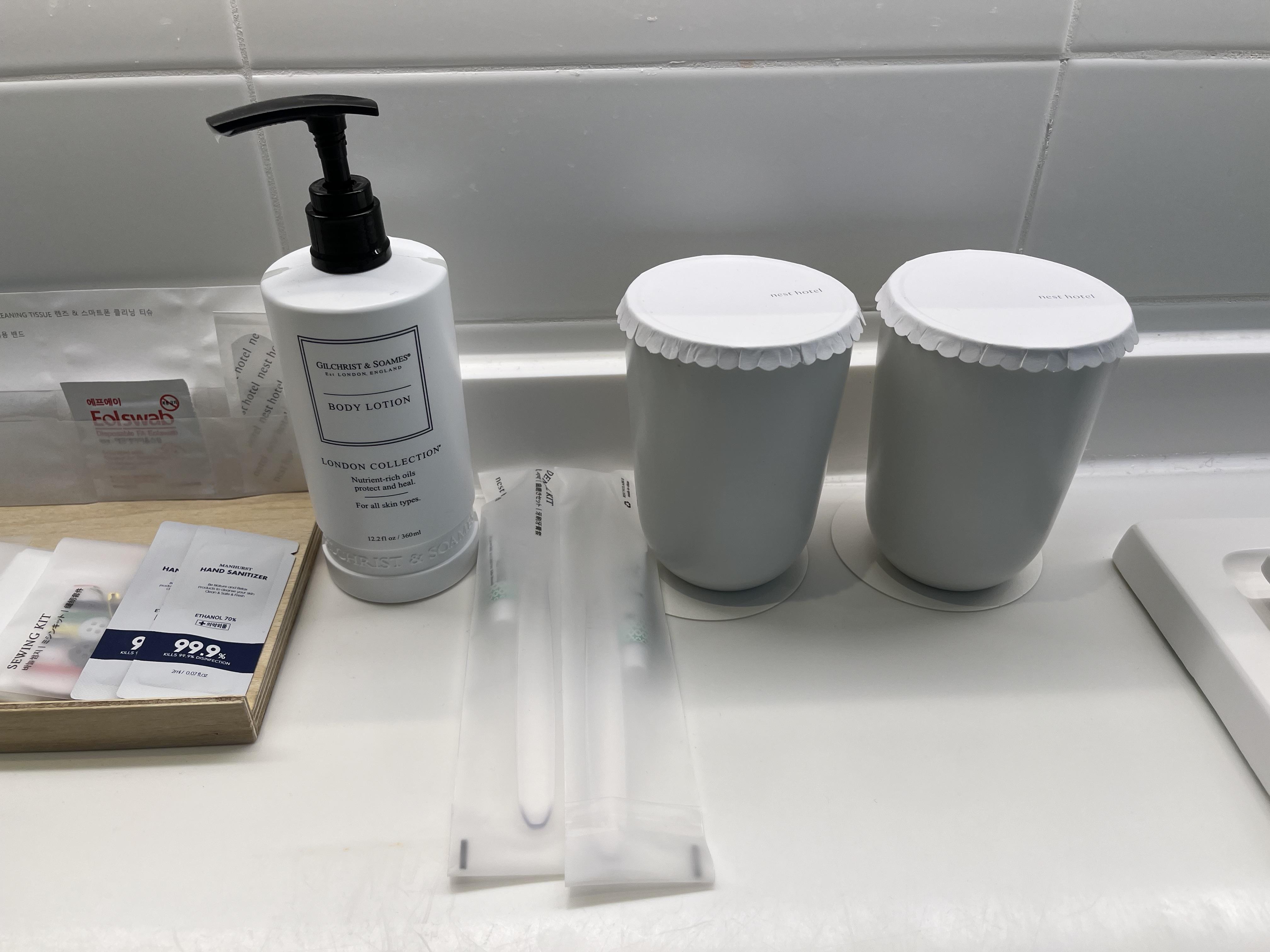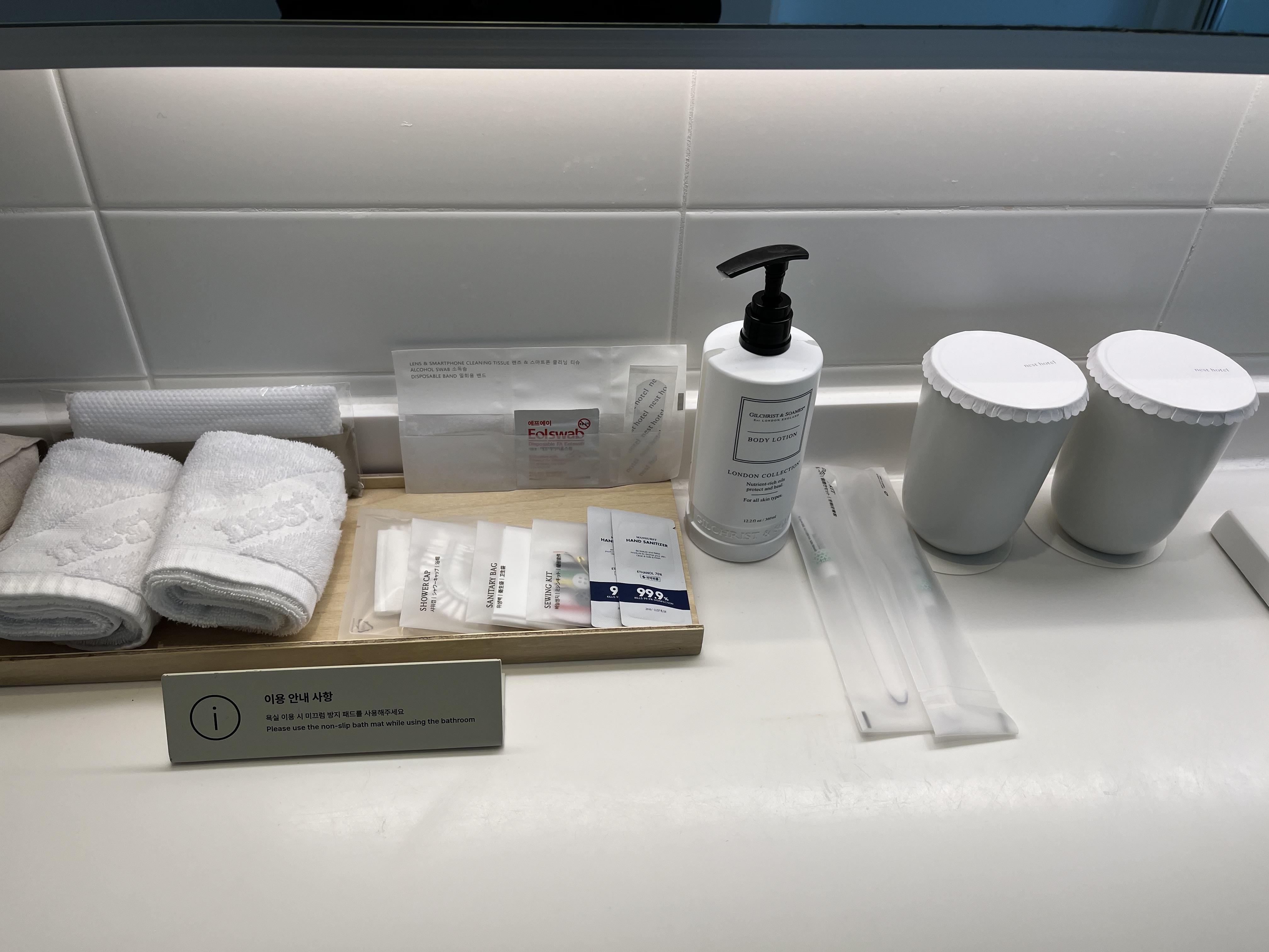 어메니티는 이름 모를 곳의 다회용 용기로 되어있고, 일회용 밴드에 알콜스왑까지 있어요.