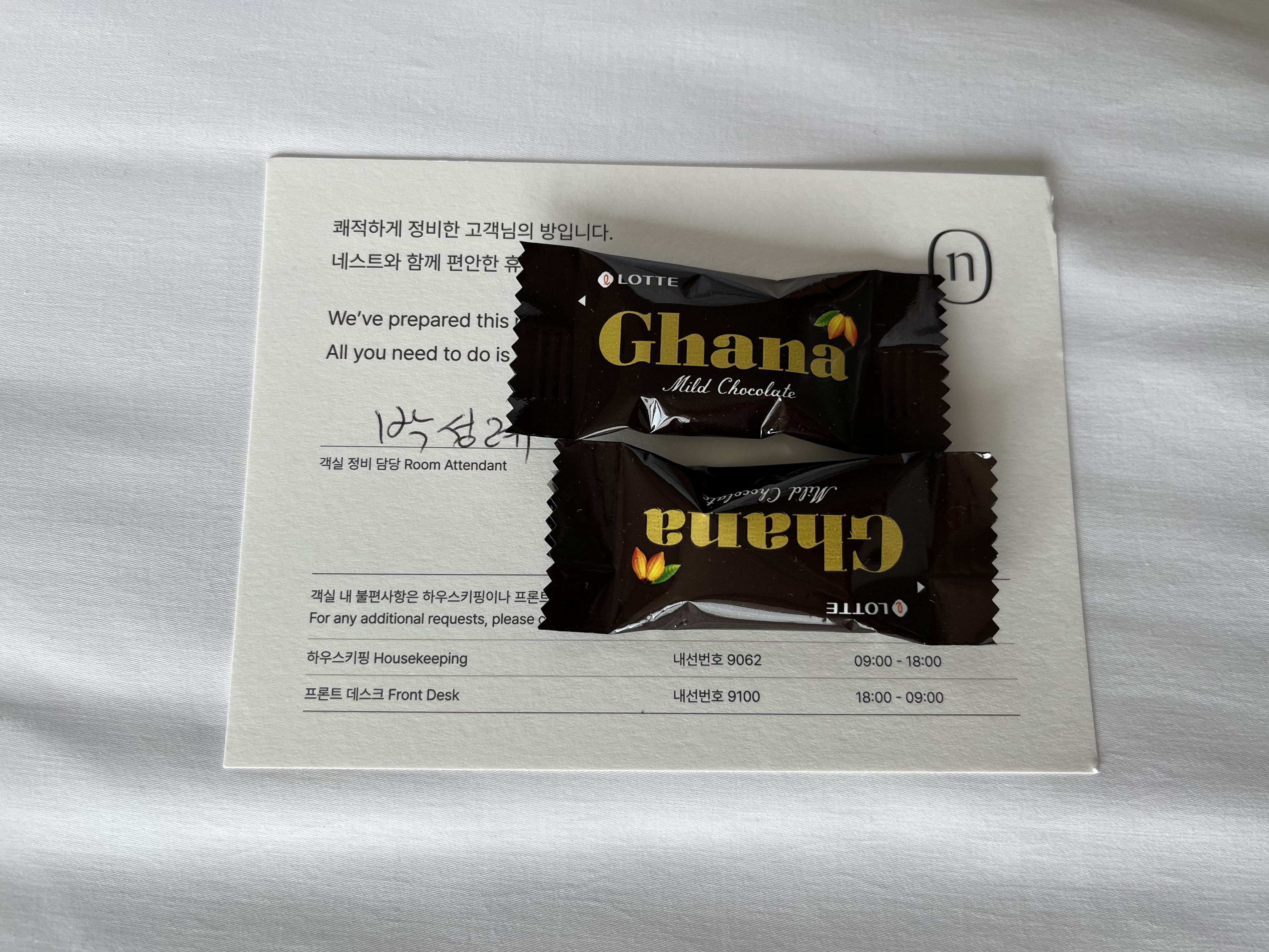 침대 한켠에 놓인 가나초콜릿이 너무나 센스가 있고 달콤한 순간이었습니다.