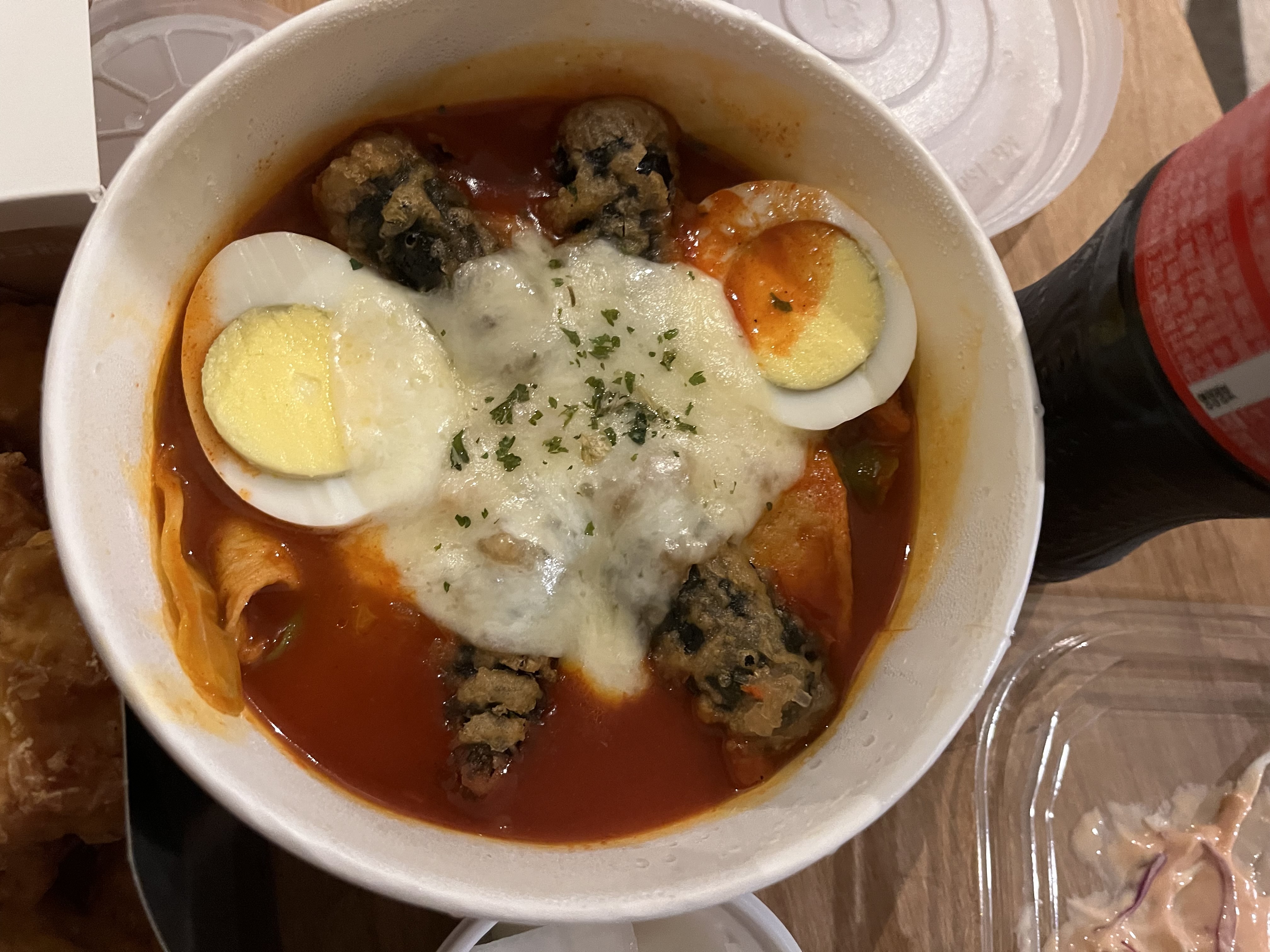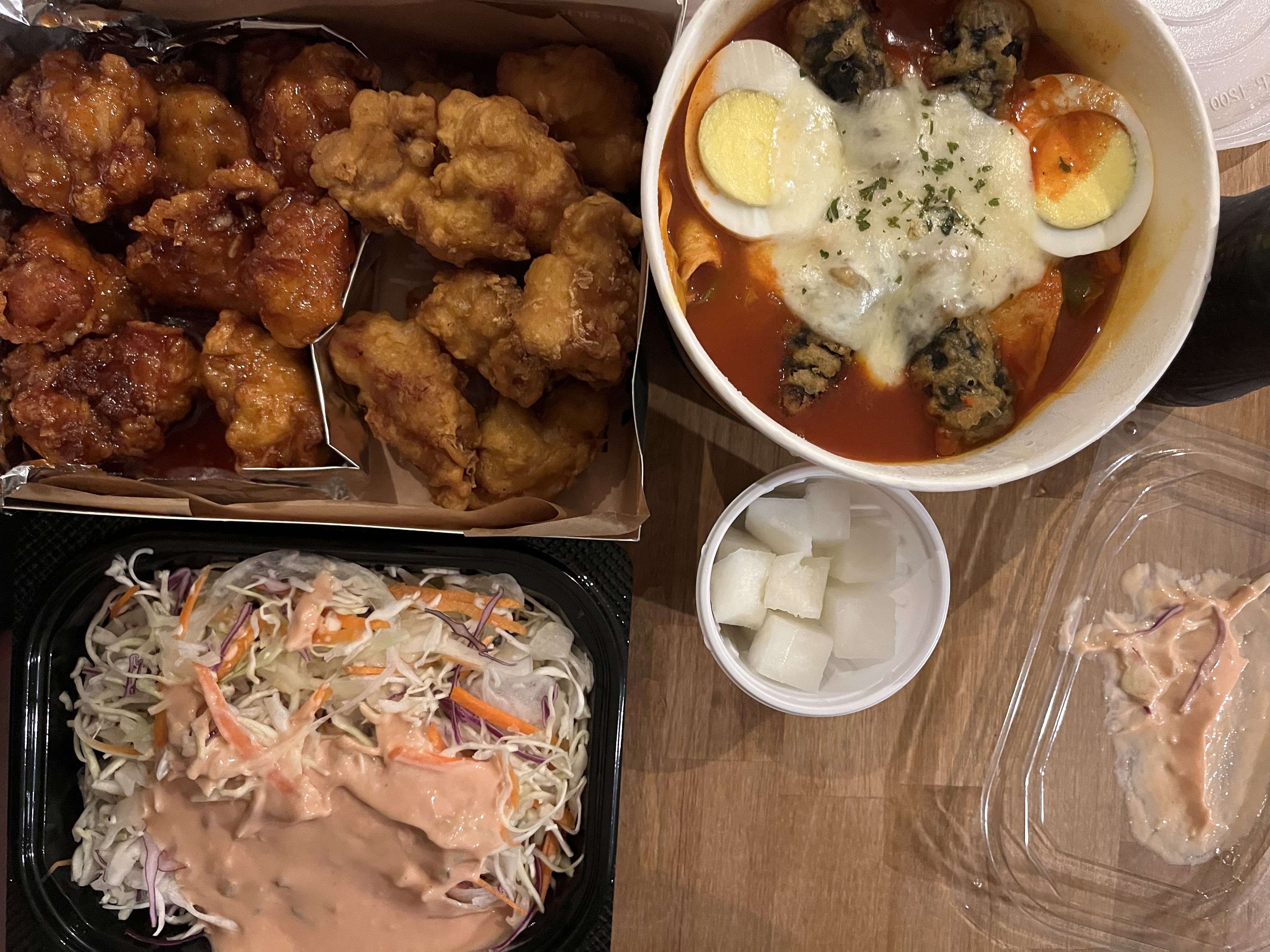 뼈가 더 맛있겠지만... 저희는 와이프의 어명에 의해 순살로 후라이드 양념 반반에 떡볶이 1개 양배추샐러드 1개 추가했습니다.