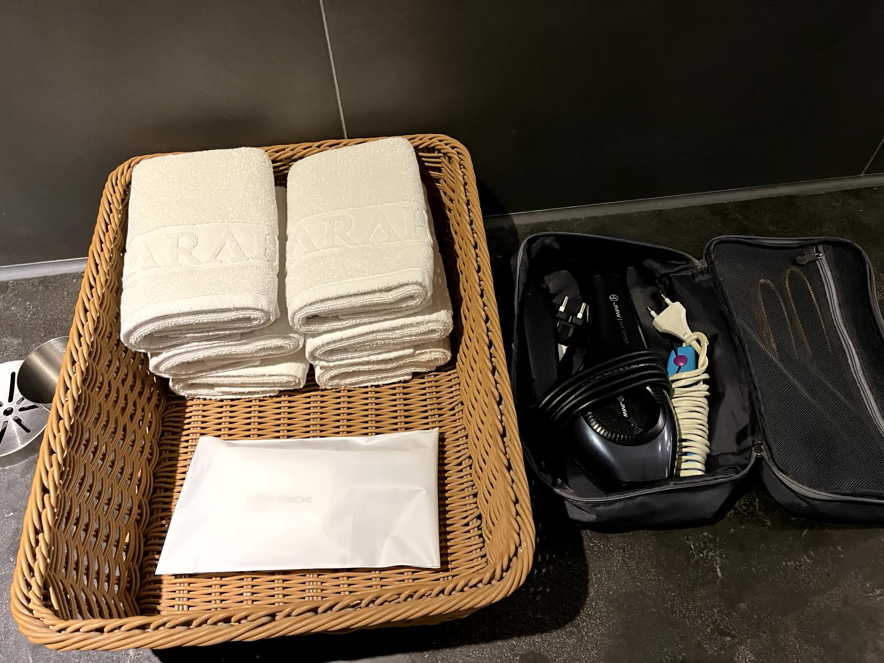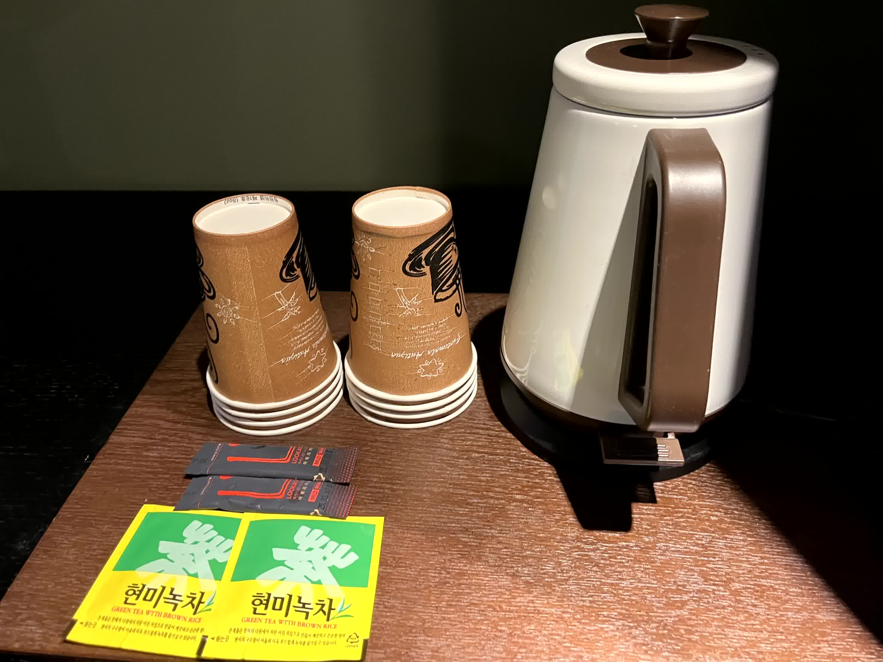 수건은 기본 6개까지 제공하고, 생수는 1층 로비에서 가져올 수도 있고, 객실에도 총 6개가 구비되어 있습니다.