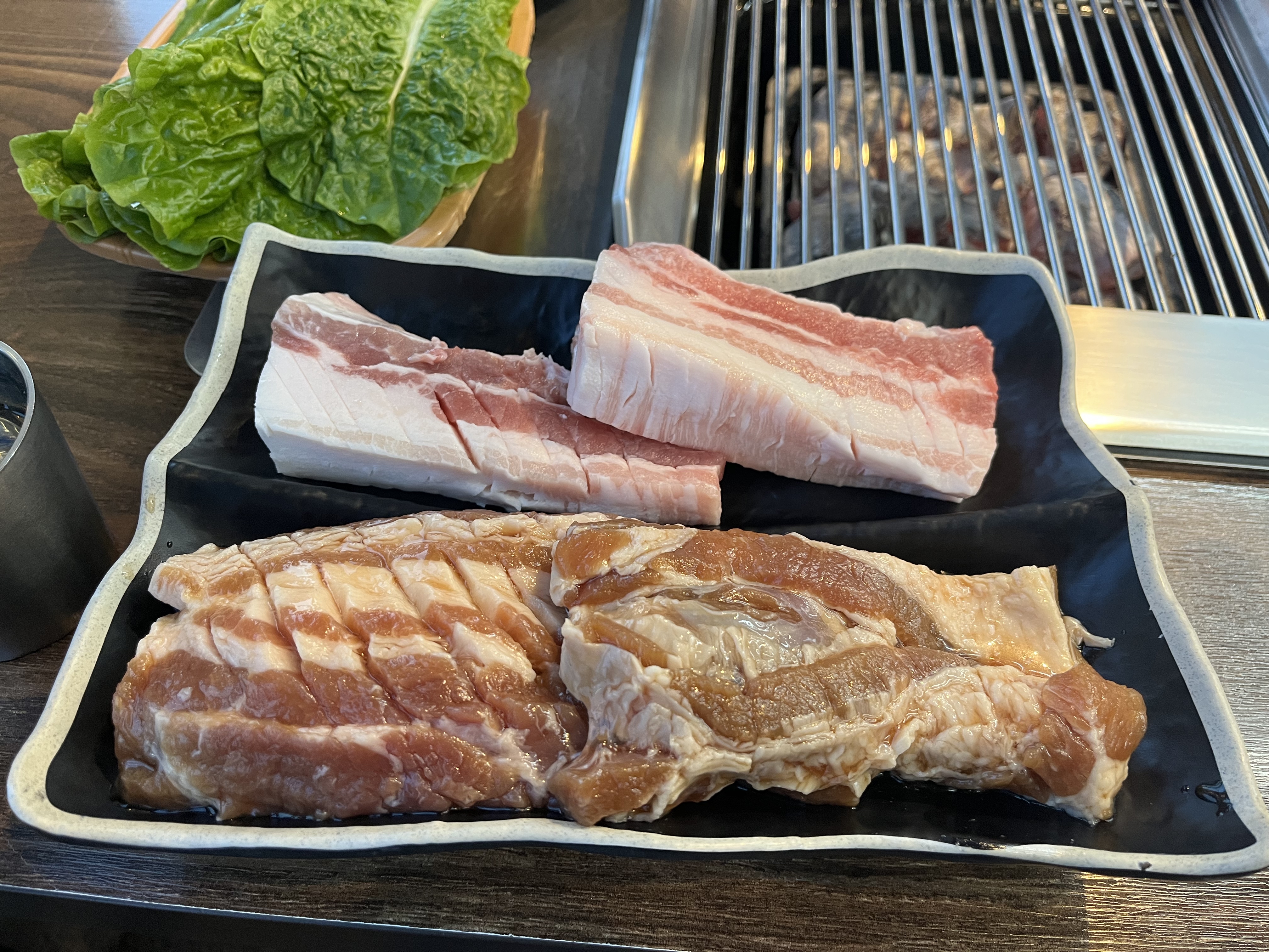 저희는 뼈삼겹양념돼지갈비 하나랑 뼈삼겹생돼지갈비 하나