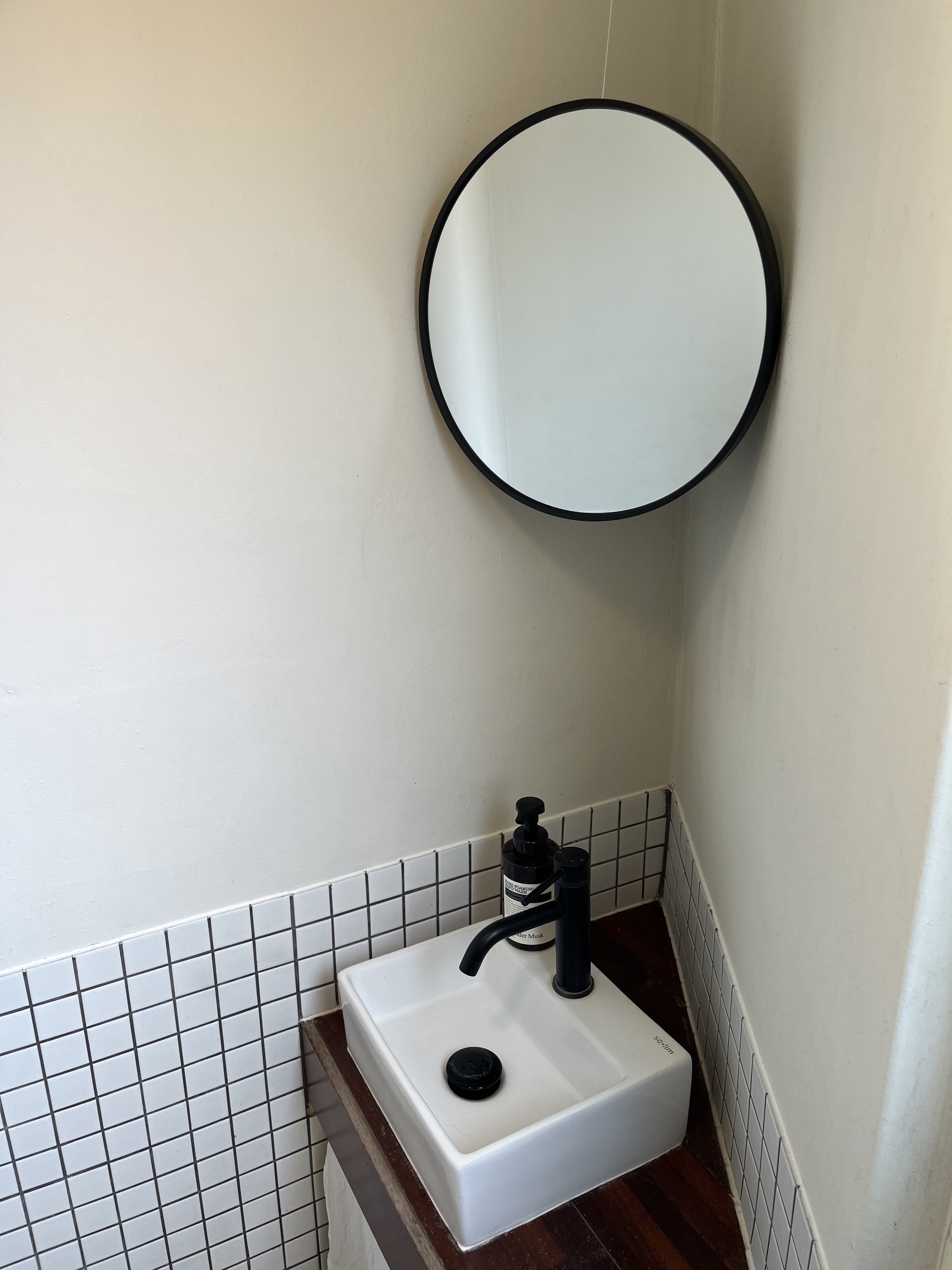 단조로움을 피하기 위해 문은 우드로 하되, 바닥은 1.2m 높이 정도까지는 격자타일을 붙이고 그 위는 흰색 도장을 한게 눈에 띄었습니다. 그리고 거울이 아래 사진처럼 2곳에 붙어있는데, 이 또한 센스 넘치는 인테리어죠.