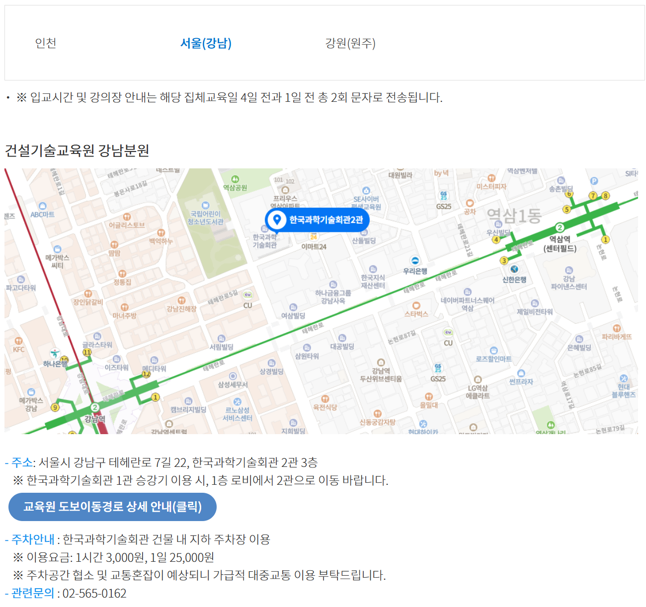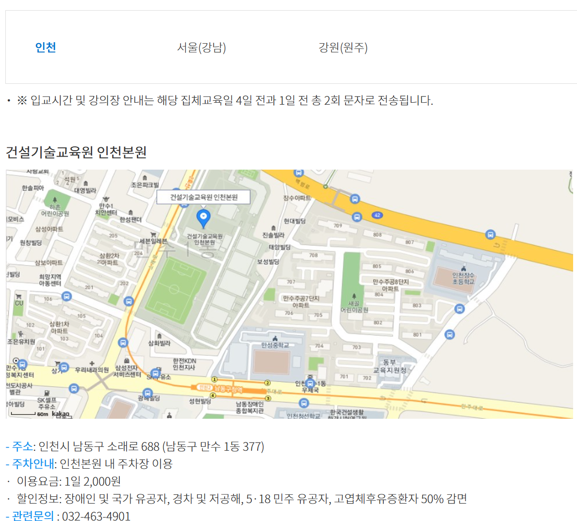 일단 건설기술교육원 인천본원과 강남분원 모두 주차가 가능합니다.